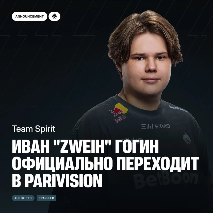 Источник: HLTVОрганизация Team Spirit по Counter-Strike 2 в своих социальных сетях подтвердила трансфер Ивана «zweih» Гогина. Молодой киберспортсмен продолжит карьеру в составе **PARIVISION.**Молодой киберспортсмен продолжит карьеру в составе PARIVISION, где займет место ранее исключенного Андрея «AW» Анисимова.
