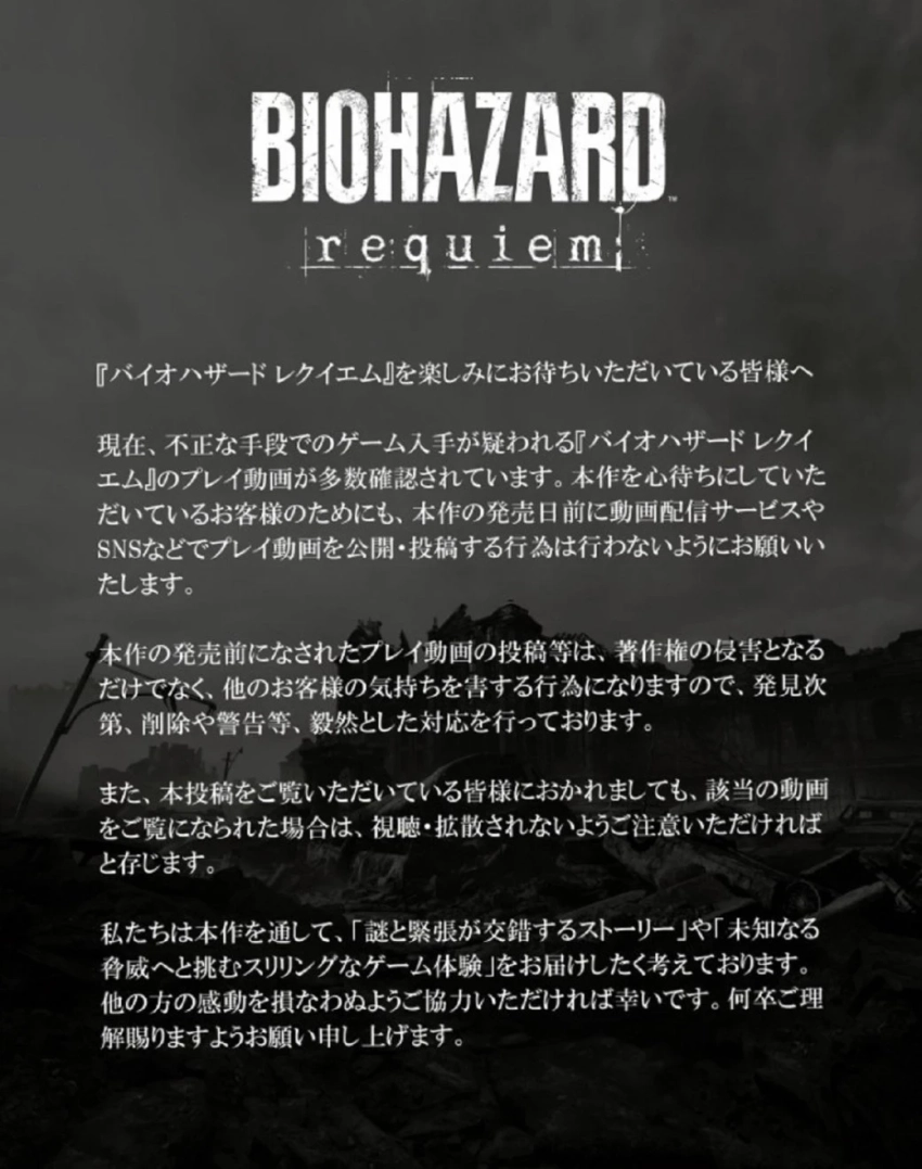 Capcom пообещала бороться с распространением информации о сюжете Resident Evil Requiem до релиза, который состоится 27 февраля на PC, PlayStation 5, Nintendo Switch 2 и Xbox Series. По мнению японской компании, публикация утечек — это и неуважение к сообществу ценителей видеоигр, и нарушение авторских прав.