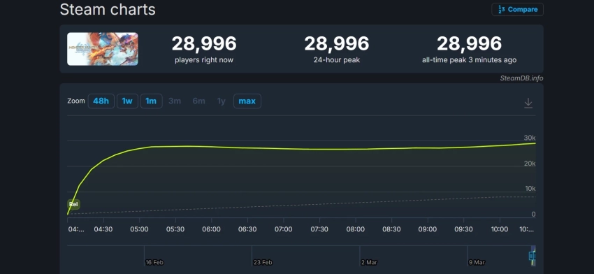 Пиковый онлайн Monster Hunter Stories 3 в Steam превысил 28 тысяч игроков и продолжает расти. Это больше первой части Stories (две тысячи человек на пике), но слегка меньше второй (почти 35 тысяч одновременных игроков).