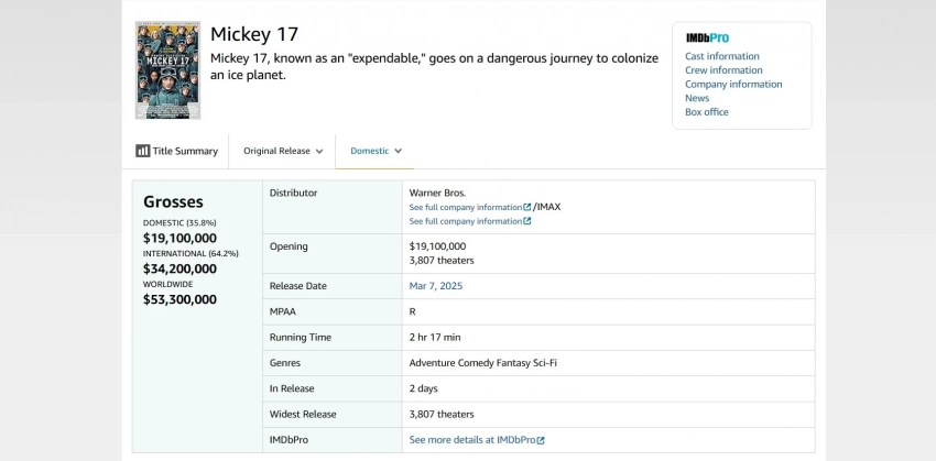 Микки 17» — 19,1 млн долларов в США (53,3 млн долларов в мире);