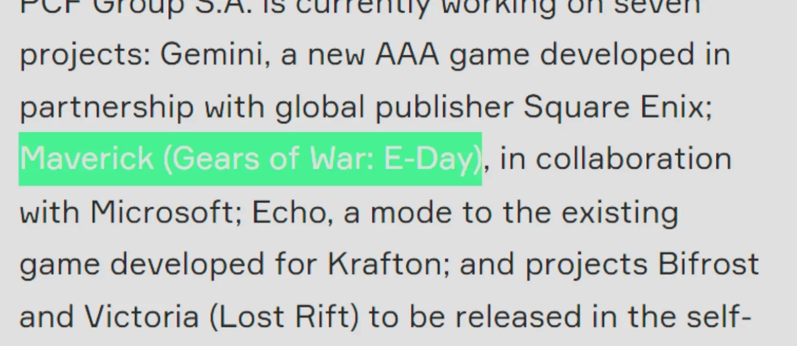 Там People Can Fly рассказала о проектах в работе, среди которых есть и Gears of War: E-Day, которая создаётся «в коллаборации с Microsoft». Предположить о том, что Maverick является новой частью Gears of War, было сложно из-за того, что основными разработчиками является студия The Coalition. People Can Fly выступает лишь партнёром.