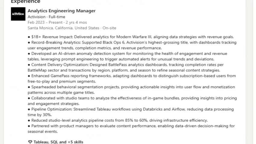 Самое интересное о кино на YouTube канале Игромании!Обложка: скриншот Call of Duty: Black Ops 6В сети обратили внимание на портфолио аналитика, который трудится в Activision более двух лет и приложил руку к запуску Call of Duty: Modern Warfare 3 (2023) и последующей Call of Duty: Black Ops 6. По словам сотрудника, последняя уже успела стать самой прибыльной игрой компании с момента своего выхода в ноябре 2024 года.