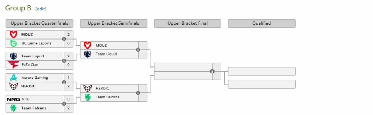 Уже отыграно несколько матчей в верхних сетках групп A и B, поэтому определись первые команды, прошедшие в полуфинал. Текущие результаты: