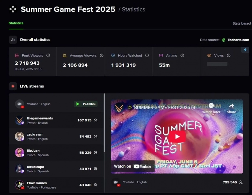 Как сообщает Esports Charts, презентация поставила рекорд по количеству зрителей: 2 718 943. Общее количество часов просмотров Summer Game Fest 2025 достигло 1 913 319, и в среднем за анонсами следило более двух миллионов зрителей.
