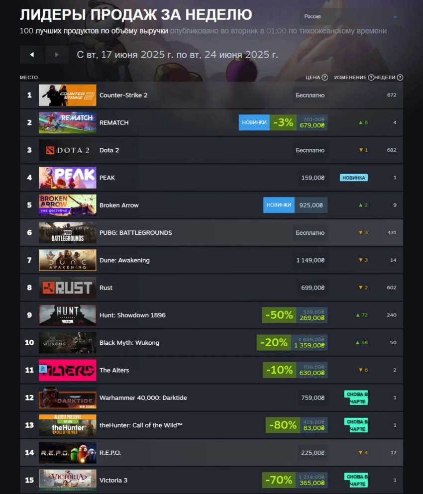 Ещё одним новичком чарта стала Peak, кооперативное альпинистское приключение, которое продалось миллионным тиражом за шесть дней после релиза. А скидки привели к тому, что в чарт вернулись Dead by Daylight и Black Myth: Wukong.