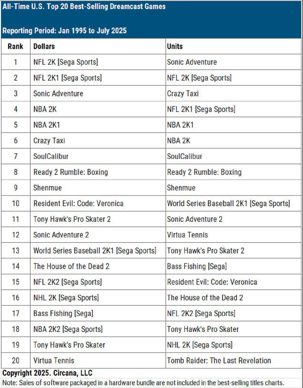 Например, приключенческая Sonic Adventure стала лидером по продажам в штуках, а также закрывает первую тройку по выручке (впереди лишь спортивные NFL 2K и NFL 2K1). Безумная Crazy Taxi находится на шестом месте по выручке, причём Sega создаёт перезапуск игры, которую инсайдеры сравнивают с GTA.