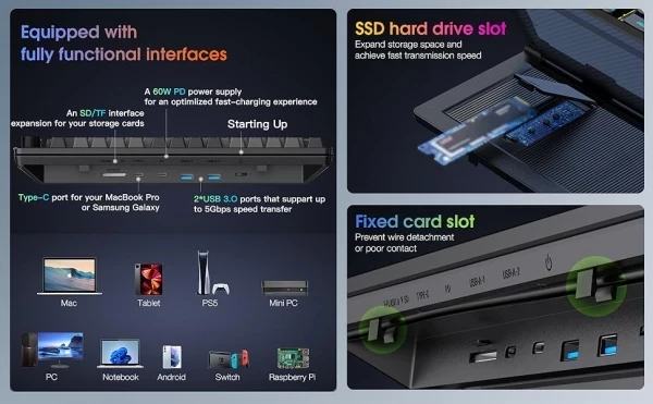 В продаже появилась удивительная и новаторская механическая клавиатура Kwumsy K3, которая нисколько не похожа на другие модели. Данная модель клавиатуры выделяется тремя ключевыми деталями,. Прежде всего, великолепный 13-дюймовый сенсорный экран является одной из причудливых особенностей клавиатуры. Кроме того, Kwumsy K3 оснащена слотом, предназначенным специально для внутреннего SSD-накопителя. Более того, наличие различных внешних портов отличает эту клавиатуру от множества других моделей на рынке. Так же в Kwumsy K3 предлагается обилие портов для подключения различных устройств.