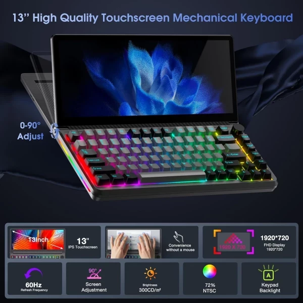 Kwumsy K3 — это механическая клавиатура с 82 клавишами. Но она также оснащена 13-дюймовым сенсорным дисплеем над клавиатурой, что дает вам еще один способ взаимодействия с компьютером или мобильным устройством.