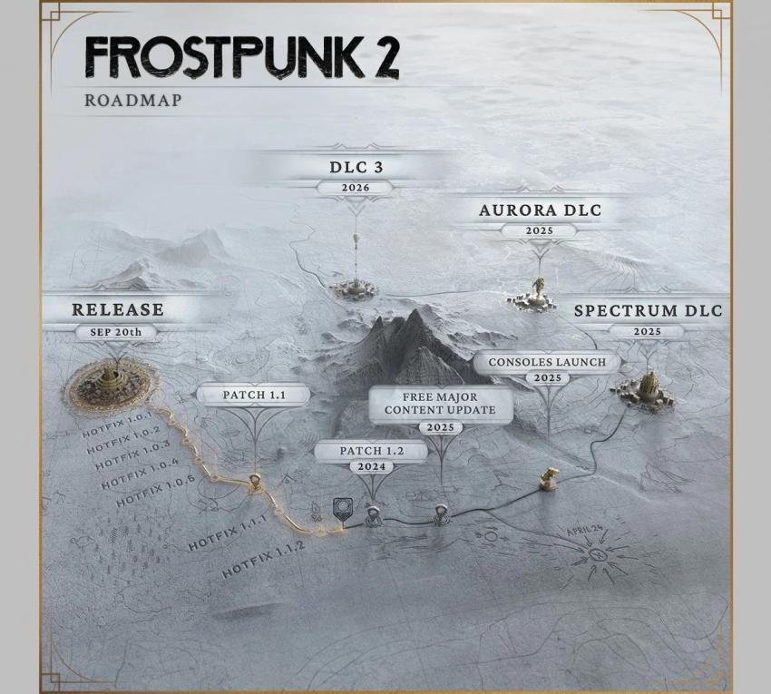 В следующем году разработчики собираются выпустить два платных дополнения, пока что они выступают под рабочими названиями Spectrum и Aurora. Ещё одно дополнение выпустят в 2026 году. Пока что о них ничего не известно, но авторы обещают, что каждое DLC добавит нечто совершенно новое в суровый мир Frostpunk 2.