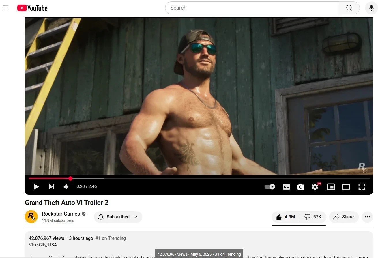 Второй трейлер GTA 6 собрал более 42 млн просмотров и занял 1-е место в трендах YouTube