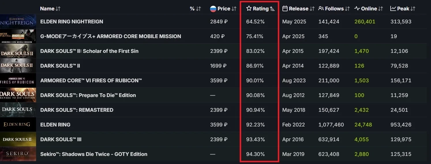 Это худший результат среди всех полноценных релизов FromSoftware в Steam. Смотрите сами: