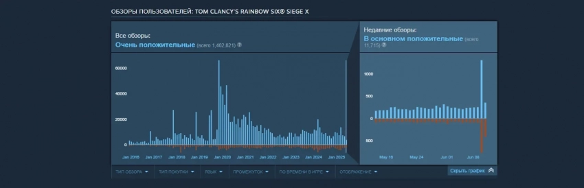Увы, переход на условно-бесплатную модель не помог Rainbow Six Siege X достигнуть новых вершин пикового онлайна в Steam — число игроков на пике за 24 часа лишь слегка превысило 142 тысячи. Для сравнения, бесплатные выходные в этом марте привлекли 145 тысяч геймеров на пике, а рекорд в почти 202 тысячи человек был поставлен в марте 2024 года.