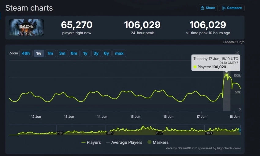 Это новый личный рекорд Dead by Daylight по пиковому онлайну на платформе Valve. Предыдущий рекорд — 105,09 человек одновременно — был поставлен в июне 2021 года, на пятую годовщину игры.