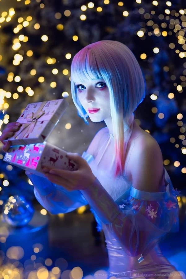 Люси стала любимицей интернета после Cyberpunk Edgerunners. Хоть Ребекка тоже приглянулась многим, но яркий образ Люси привлекает большее количество косплееров, а некоторые создают и вовсе совсем уникальные работы. Например, такой новогодний образ, который воплотила в жизни Марина Монталь.