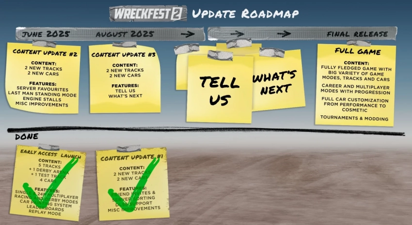 Также разработчики обновили дорожную карту, куда было включено третье контентное обновление. Оно выйдет в августе. Конкретные новинки не называются, но игроки могут ждать по паре новых автомобилей и гоночных треков. В целом же Wreckfest 2 продолжает приближаться к выходу из раннего доступа — в момент полноценного релиза игра получит обширный список режимов, большой парк транспорта, режим карьеры, поддержку моддинга и не только.